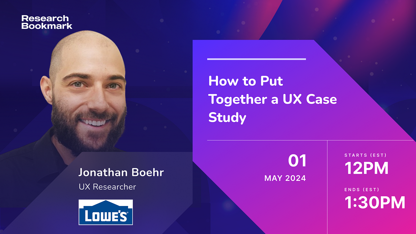 Our interactive workshop on 'How to Put Together a UX Case Study,' taking place on May 1st from 12 PM to 1:30 PM EST, equips researchers and designers with the essential skills to transform their work into a compelling narrative that will wow interviewers and land you your dream job.