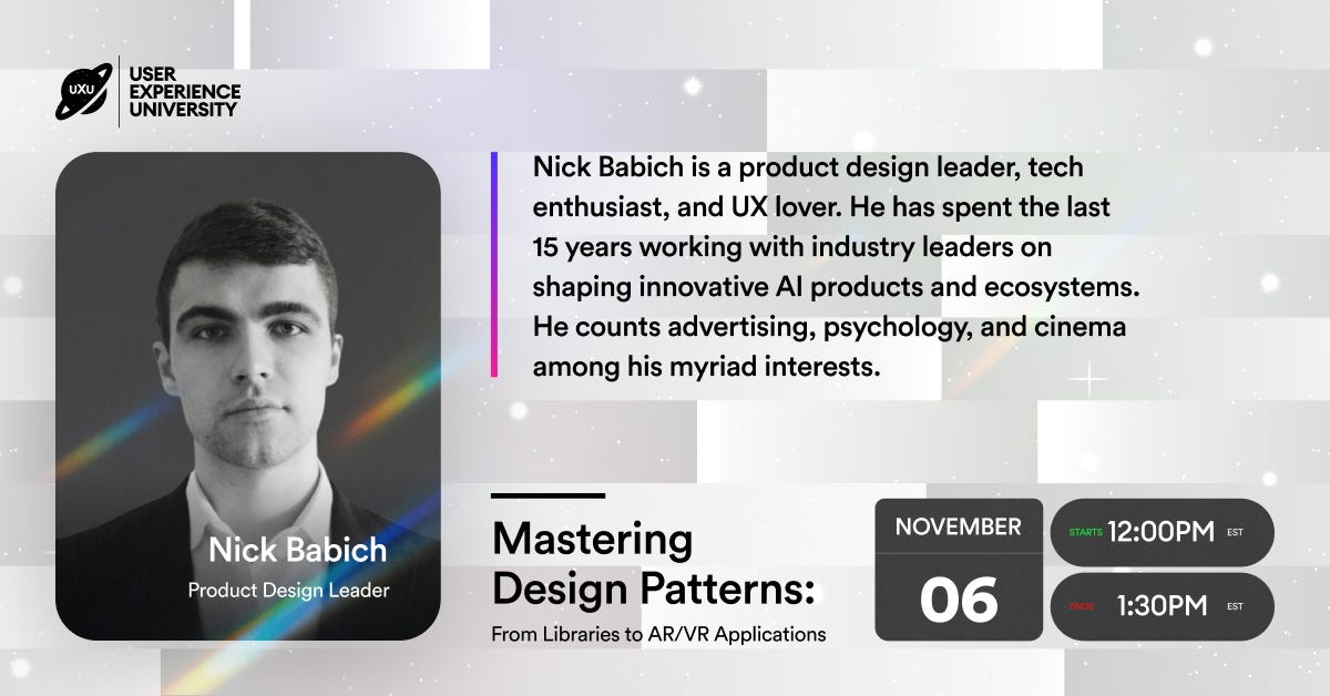 In our upcoming workshop, "Mastering Design Patterns: From Libraries to AR/VR Applications," led by Nick Babich, you’ll discover how to effectively apply design patterns to elevate your projects to the next level.