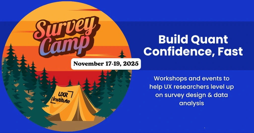 The UXR Institute is hosting Survey Camp on November 17 to 19. It is a series of live, online workshops designed to help UX professionals build practical quantitative research skills. You’ll learn how to write stronger survey questions, uncover patterns in data, and use structured analysis to support your recommendations.